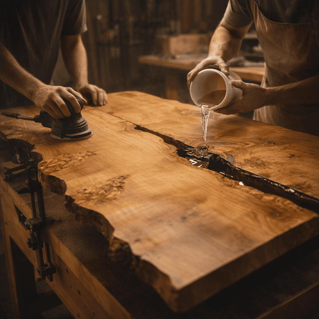 Tworzymy stoły z drewna i żywicy epoksydowej na zamówienie, dopasowane do konkretnych wnętrz i sposobu życia. Każdy projekt zaczyna się od materiału — jego struktury, proporcji i charakteru. Pracujemy w niewielkiej pracowni, gdzie każdy stół powstaje ręcznie, od wyboru drewna po finalne wykończenie.